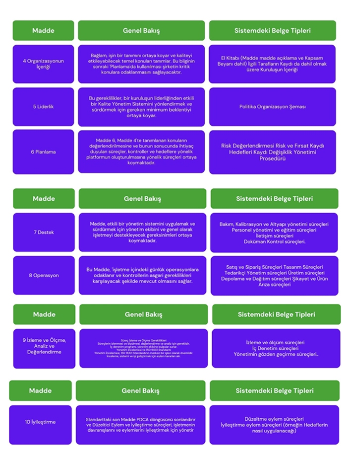 7. İyileştirme: Kalite yönetim sisteminin etkinliğini sürekli olarak iyileştirme faaliyetlerinin planlanması ve uygulanması. Hataların düzeltilmesi, düzeltici faaliyetlerin başlatılması ve süreçlerin optimizasyonu bu aşamada ele alınır. Sene boyunca açılan düzeltici faaliyetler ve kapanması etkinliklerinin ölçülmesi, kök neden analizinin yapılması ve düzeltici faaliyetlerin kapatılması tüm bu süreçlerin oluşturulduğu bölüm .
